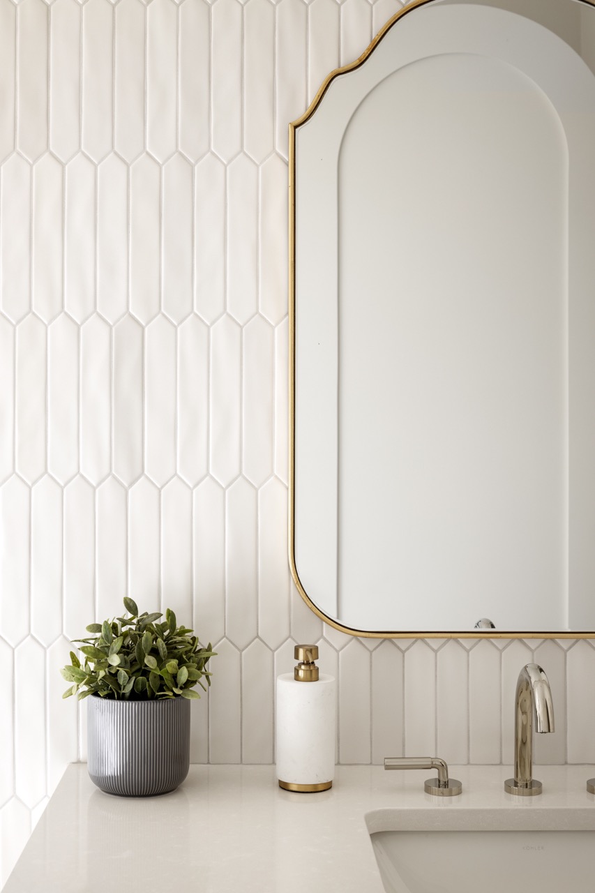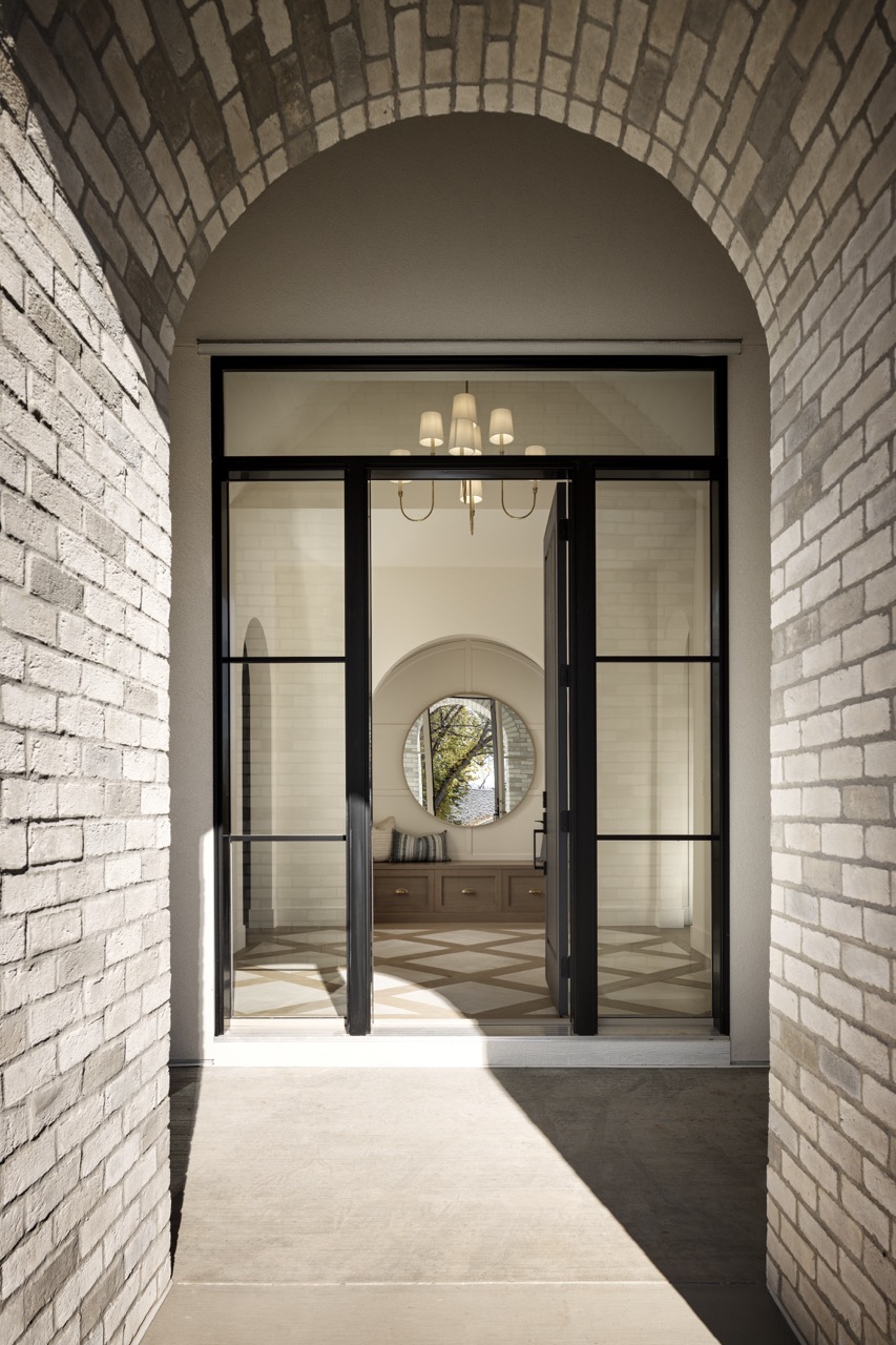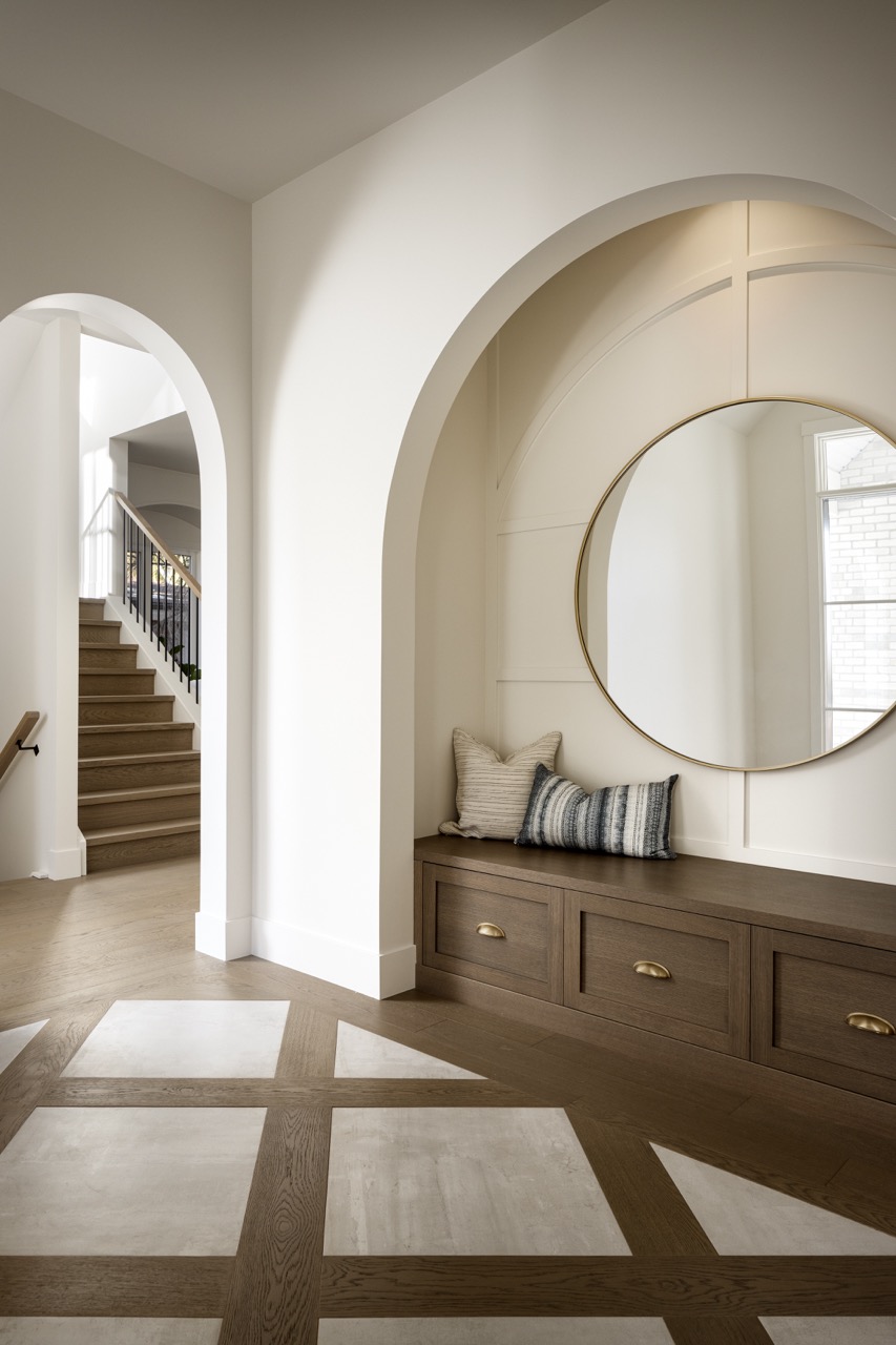 This Charleswood home features a brick barrel arch entrance, a wood bench, and elegant paneling. Inside, enjoy a striking powder room, sunlit office, and a living room with a stucco fireplace and white oak mantle. Tesoro doors lead to an outdoor space with a matching brick fireplace. The kitchen, ideal for entertaining, includes a bar and warm cabinetry. The dining area boasts vaulted ceilings and ample light.