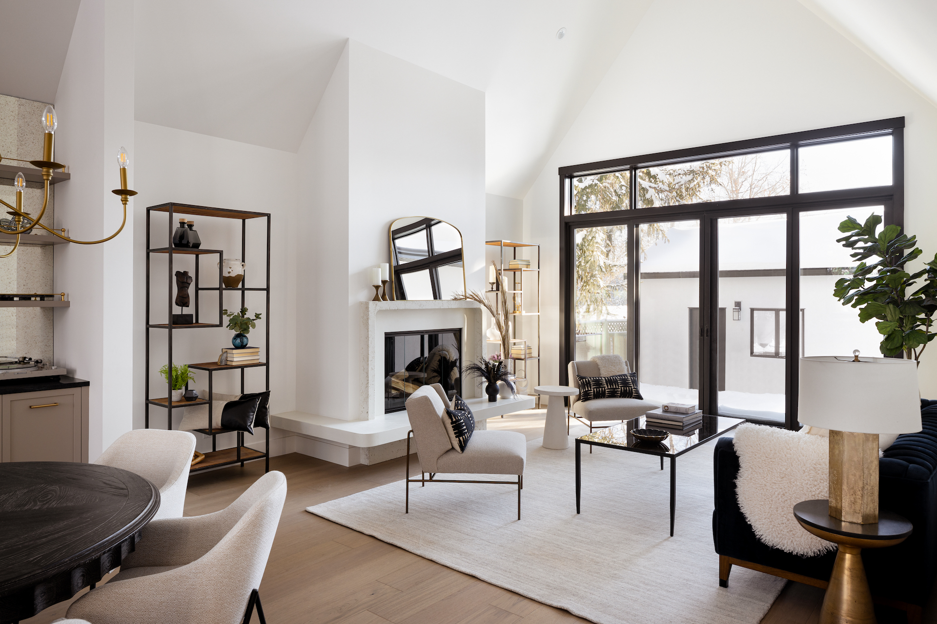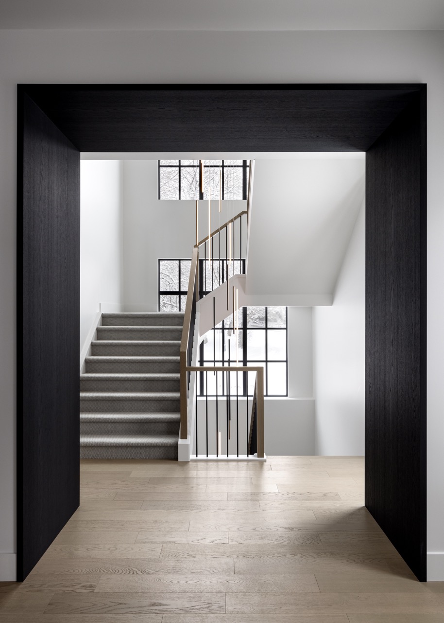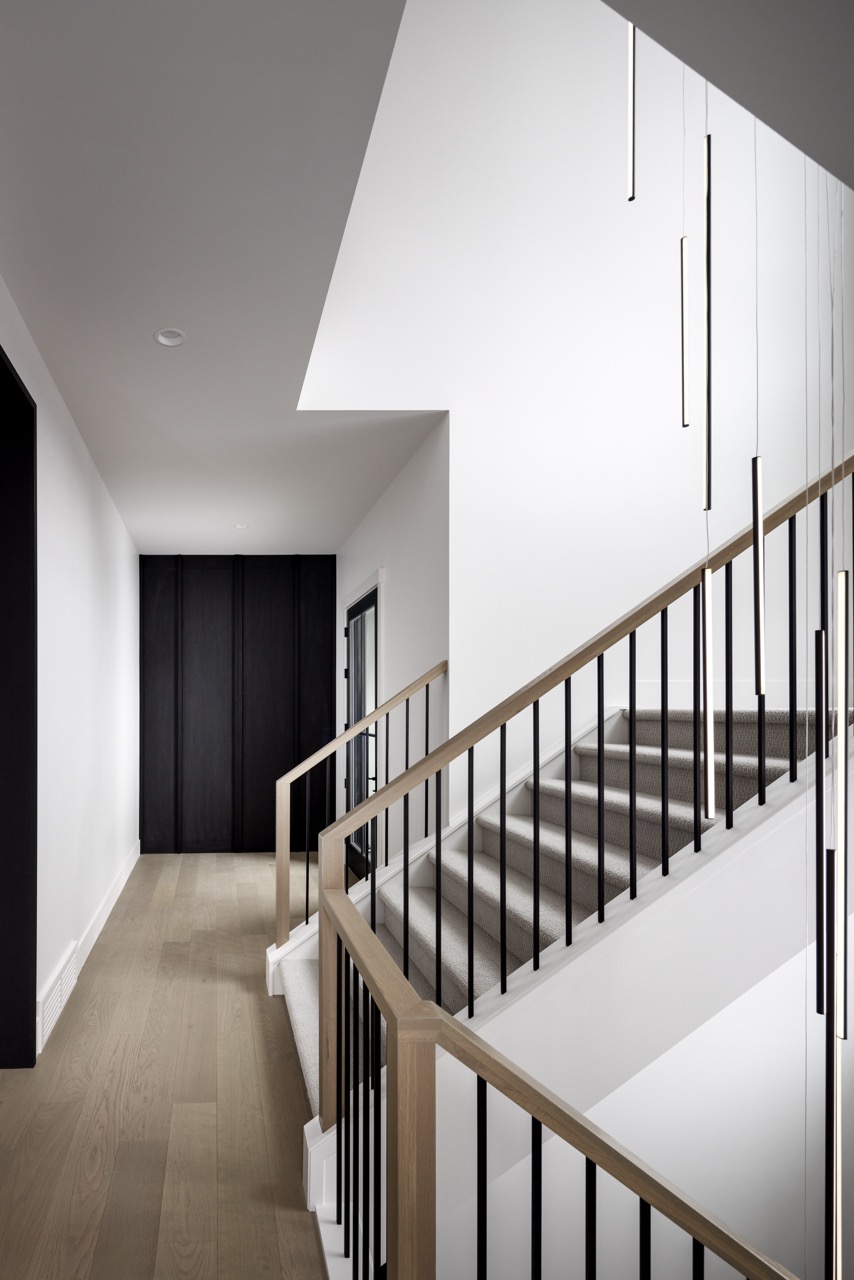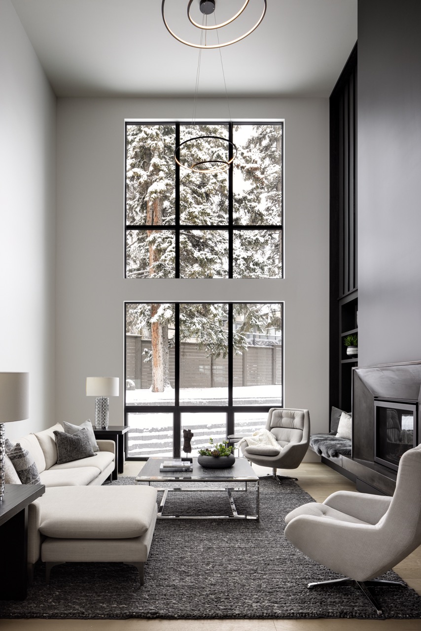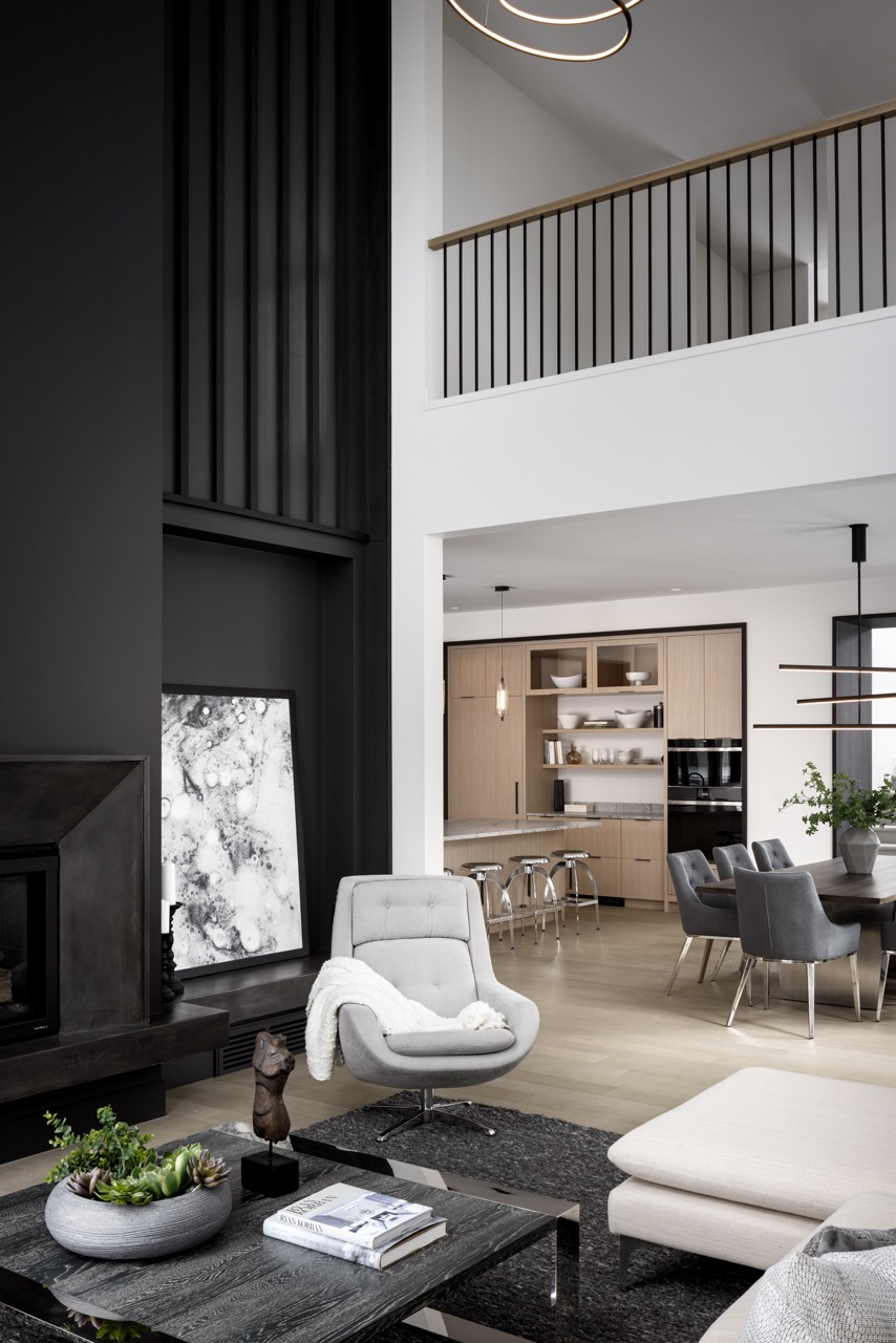 This Mount Royal modern farmhouse features floor-to-ceiling windows and a mix of white and dark tones. The foyer leads to a dining room and kitchen with paneled appliances and a stone backsplash. The great room has large windows and a concrete fireplace hearth. Upstairs, an open area and office overlook the great room. The design combines an open layout with architectural separation.