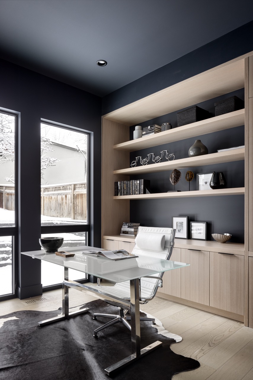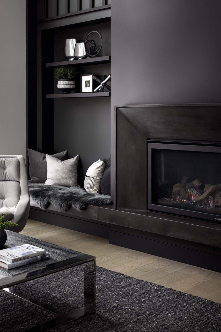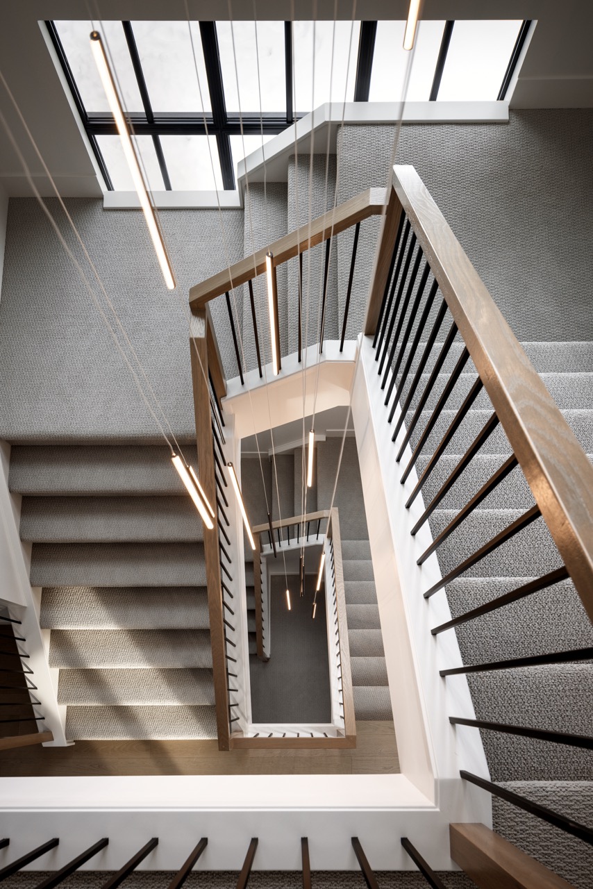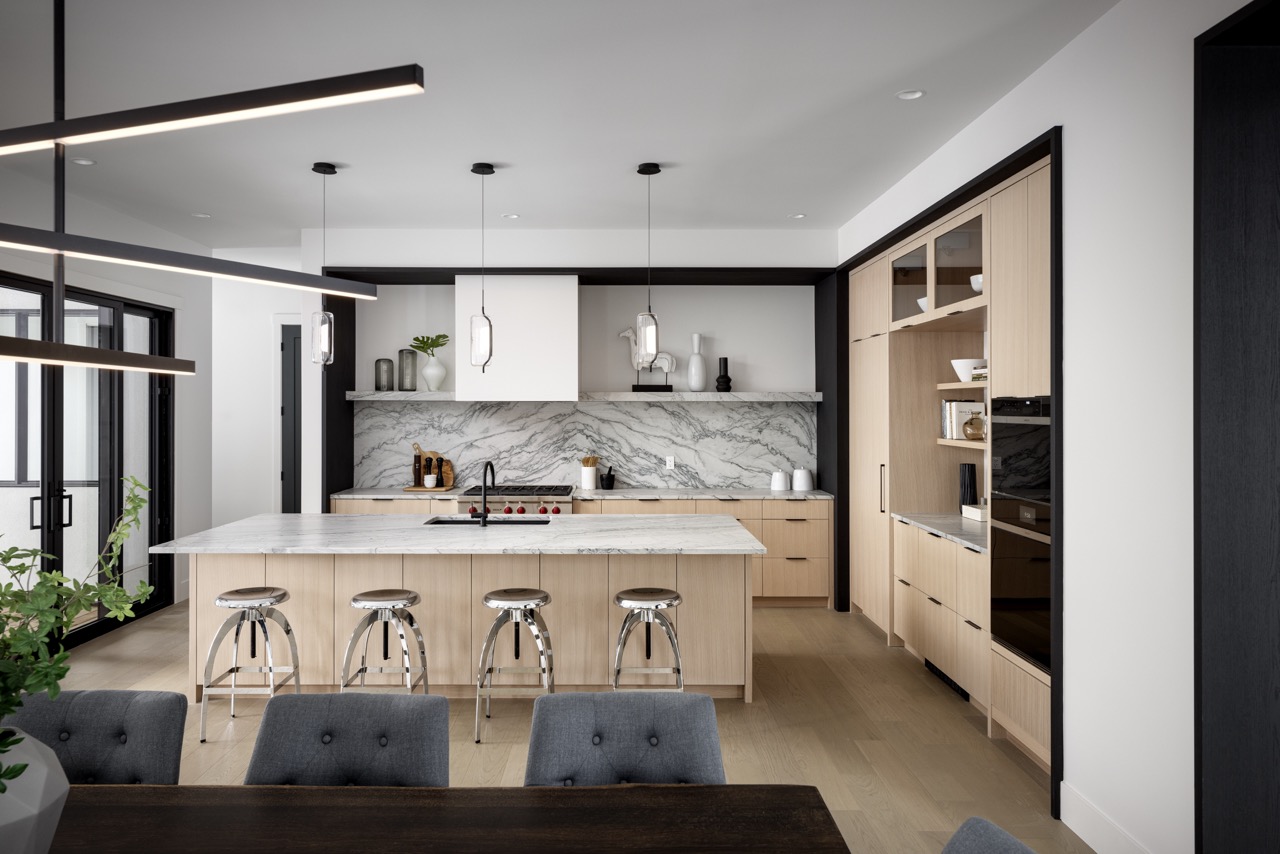 This Mount Royal modern farmhouse features floor-to-ceiling windows and a mix of white and dark tones. The foyer leads to a dining room and kitchen with paneled appliances and a stone backsplash. The great room has large windows and a concrete fireplace hearth. Upstairs, an open area and office overlook the great room. The design combines an open layout with architectural separation.