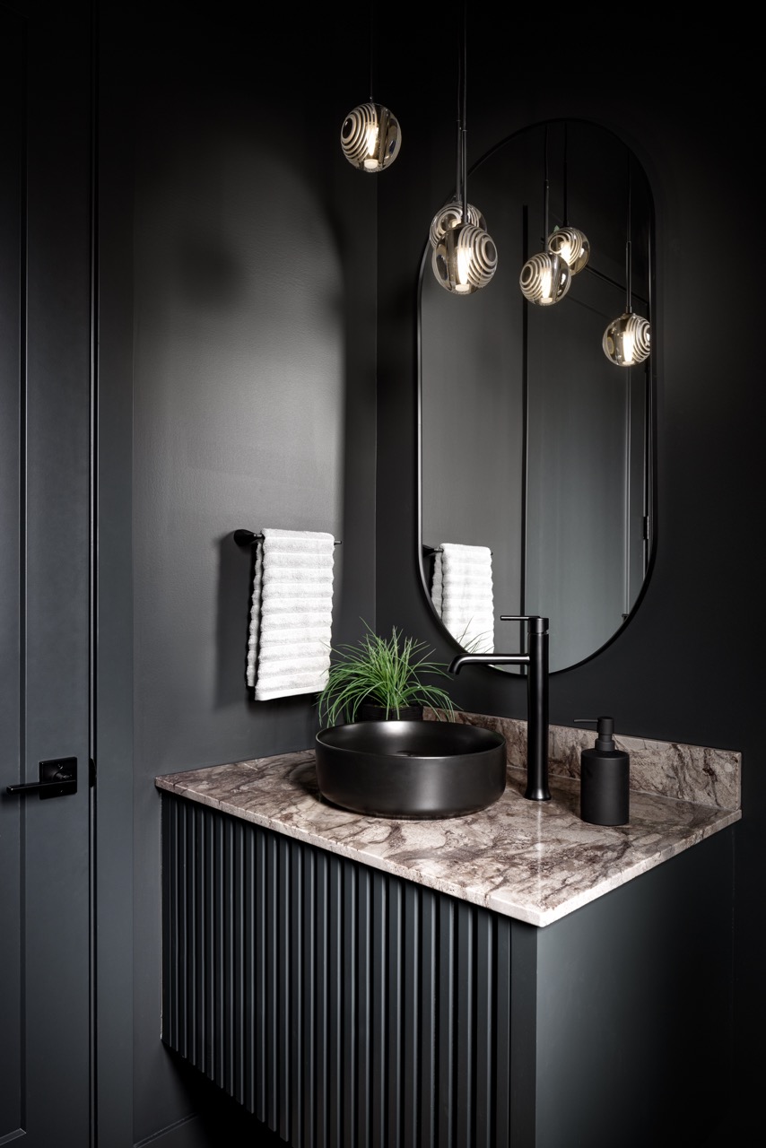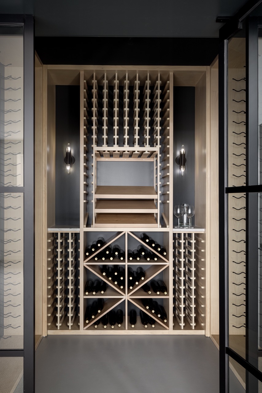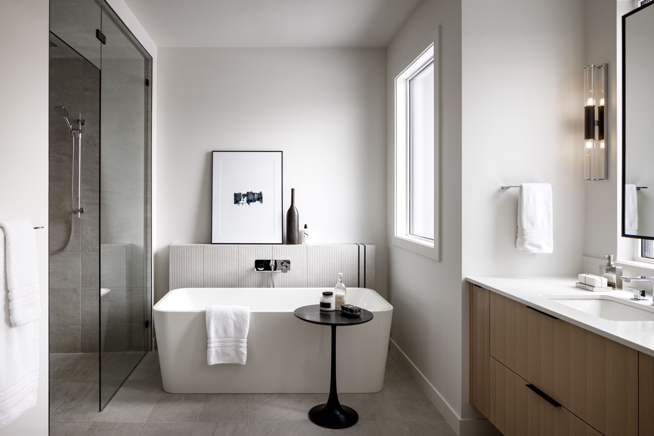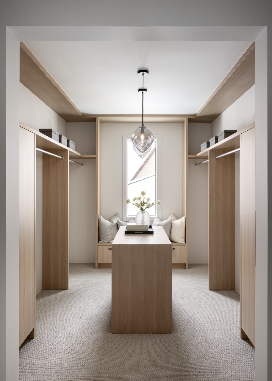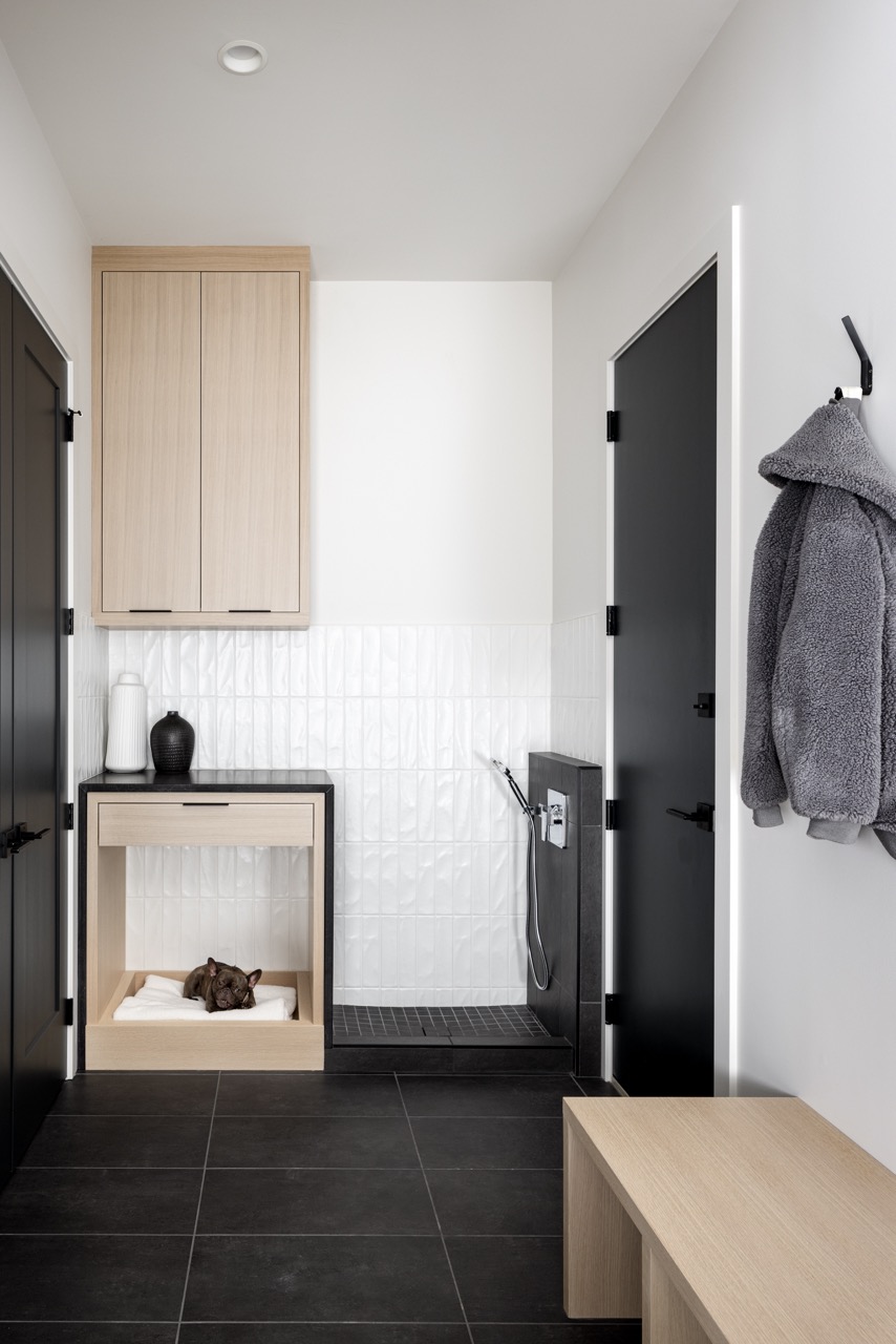 This Mount Royal modern farmhouse features floor-to-ceiling windows and a mix of white and dark tones. The foyer leads to a dining room and kitchen with paneled appliances and a stone backsplash. The great room has large windows and a concrete fireplace hearth. Upstairs, an open area and office overlook the great room. The design combines an open layout with architectural separation.
